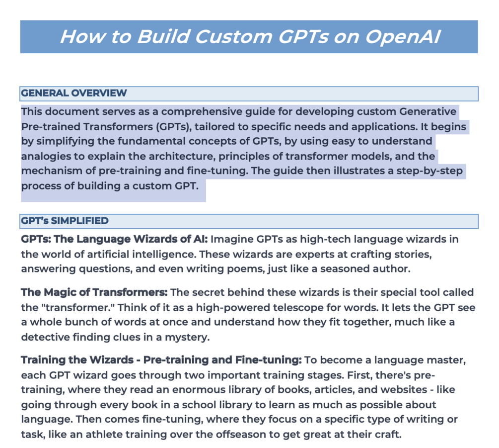This document serves as a comprehensive guide for developing custom Generative Pre-trained Transformers (GPTs), tailored to specific needs and applications. It begins by simplifying the fundamental concepts of GPTs, by using easy to understand analogies to explain the architecture, principles of transformer models, and the mechanism of pre-training and fine-tuning. The guide then illustrates a step-by-step process of building a custom GPT.